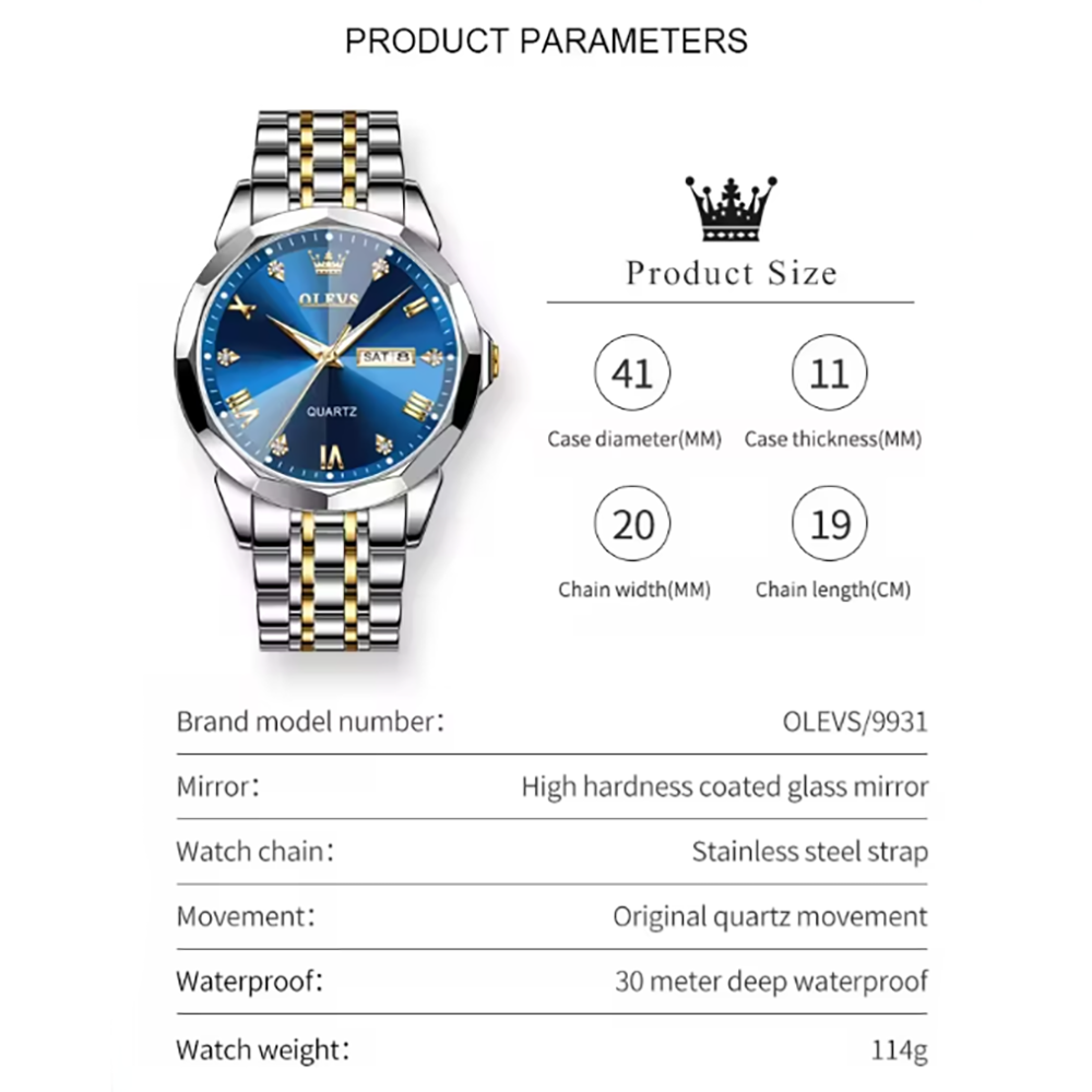 ساعت مچی مردانه OLEVS مدل 9931 یک گزینه ای شیک برای آقایانی است که به دنبال ترکیبی از طراحی کلاسیک، عملکرد قابل قبول و قیمت مناسب هستند.