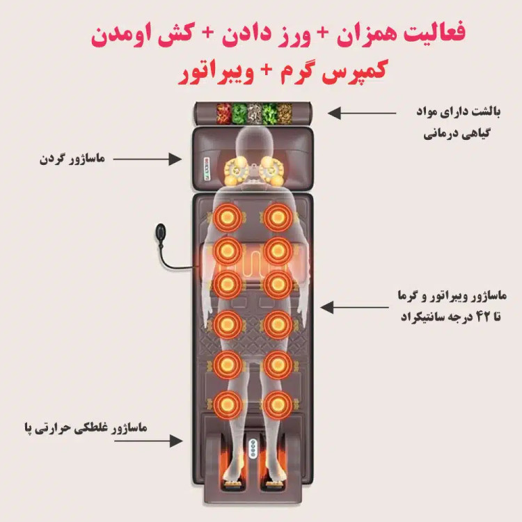 - دارای : غلتک / گرما / گیاه های درمانی در قسمت سر / ماساژ مجزا برای هر قسمت