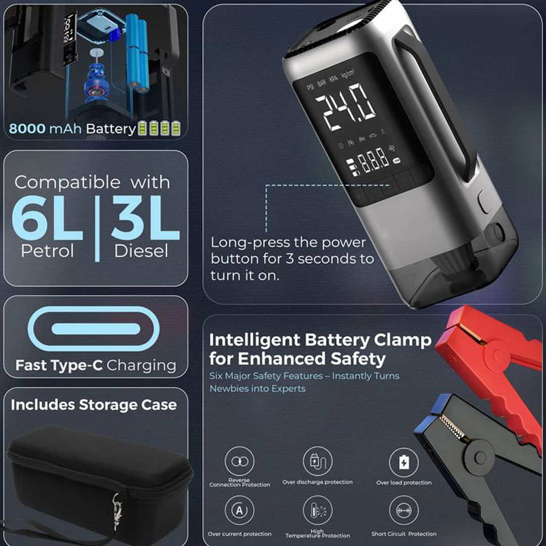 این محصول با فشار باد تا 150 PSI، جریان لحظهای 800 آمپر و باتری پرقدرت لیتیومی، مناسب استارت انواع خودروهای سواری و موتورسیکلتها است.